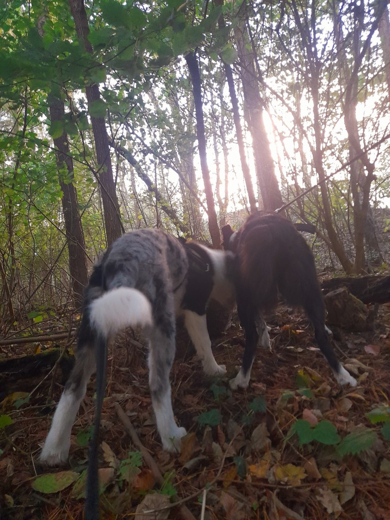 Today we’ve been to the forest for walkies and it was so much fun. Though we dodged the heavy rain, it was still muddy in places, so we both got pretty dirty.